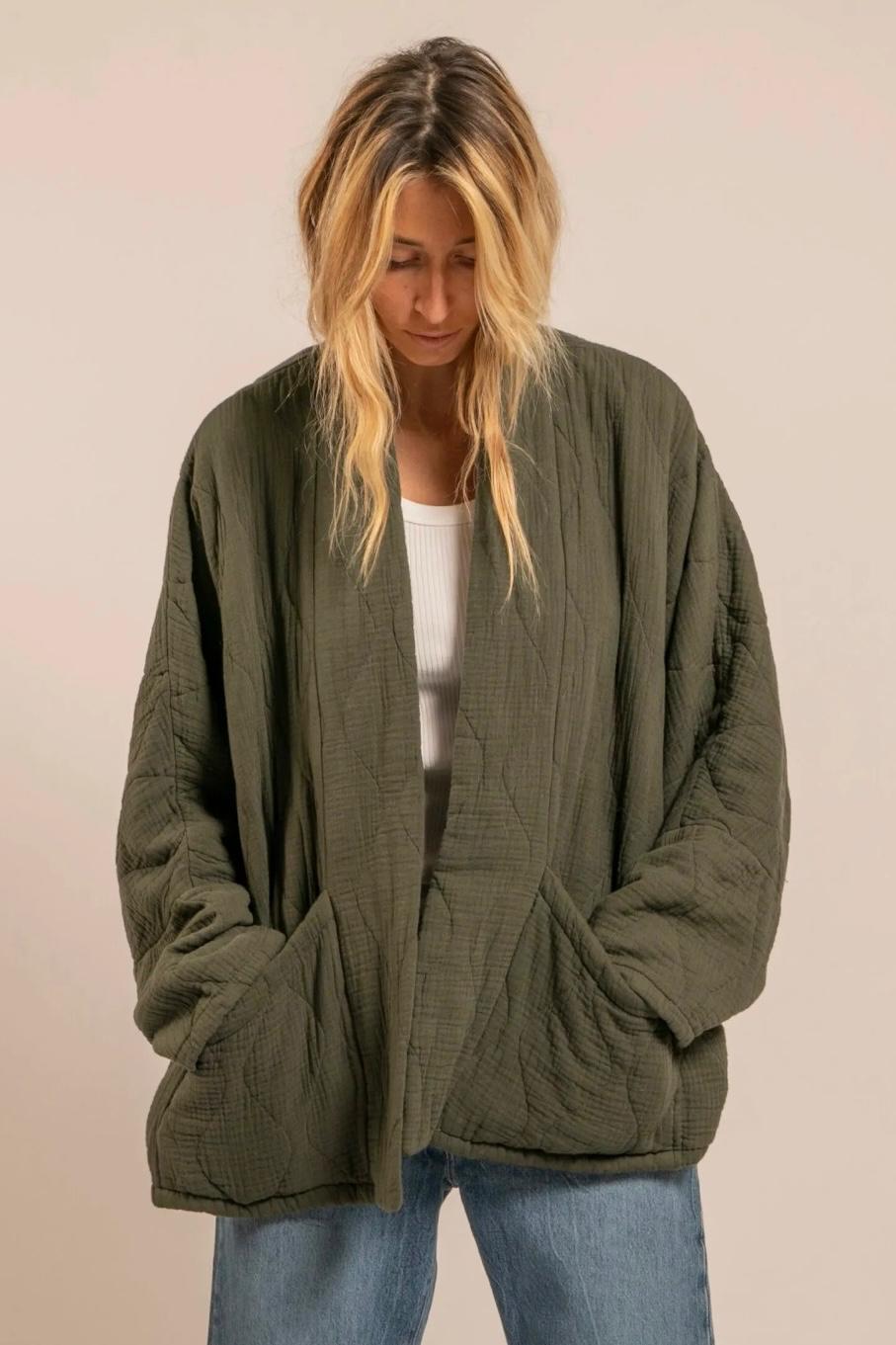 Veste kimono "Chicago" en gaze de coton kaki de la marque Aokyanos.