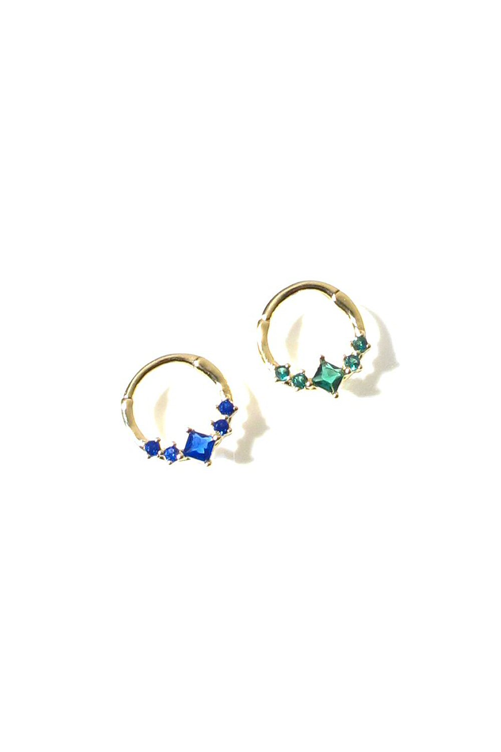 Huggie de type Clicker 8mm 'Diadème' avec ses strass vert ou bleu de la marque Parisienne Bali Temples Jewellery.