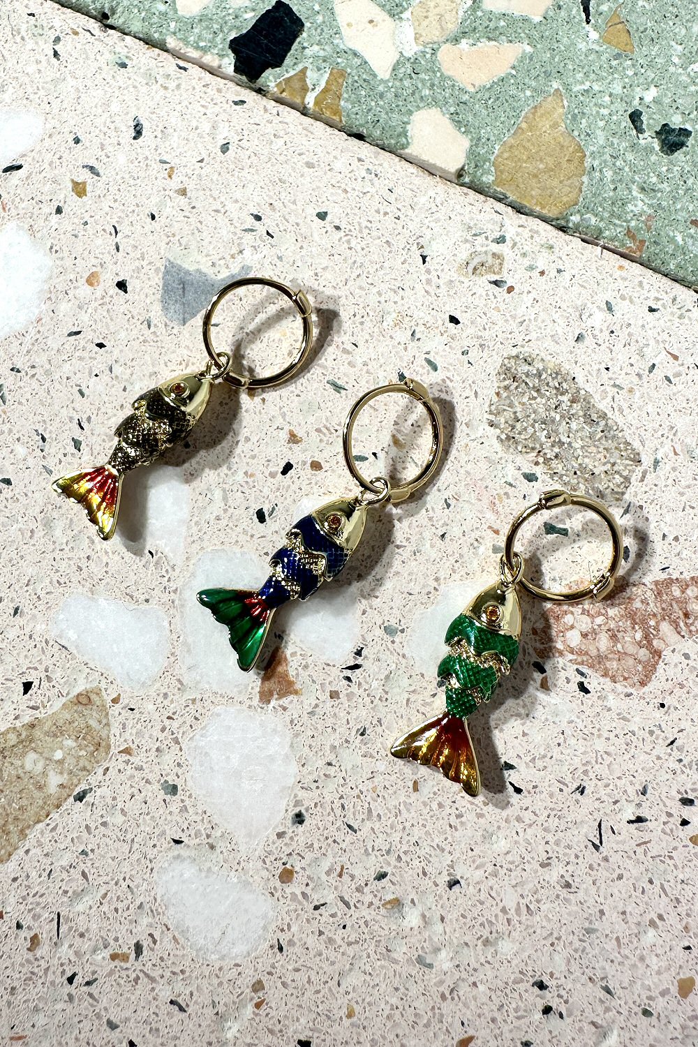Huggie "Fish émaillé" 8mm avec son poisson en laiton plaqué et émaillé de la marque Parisienne Bali Temples Jewellery.