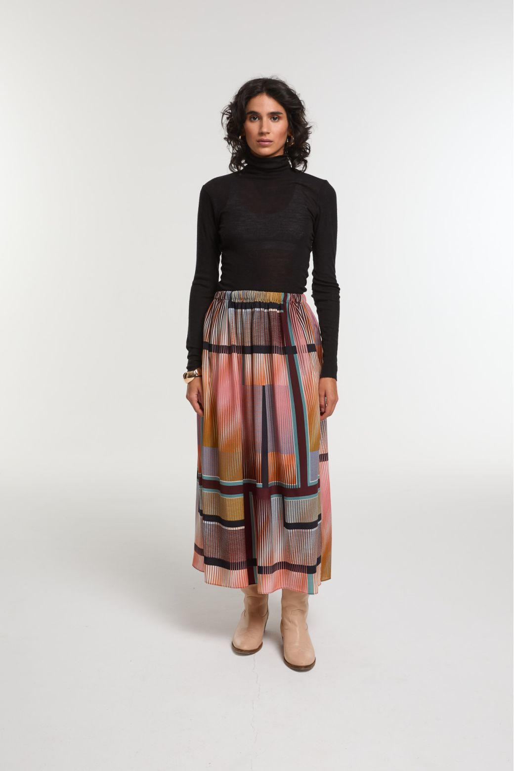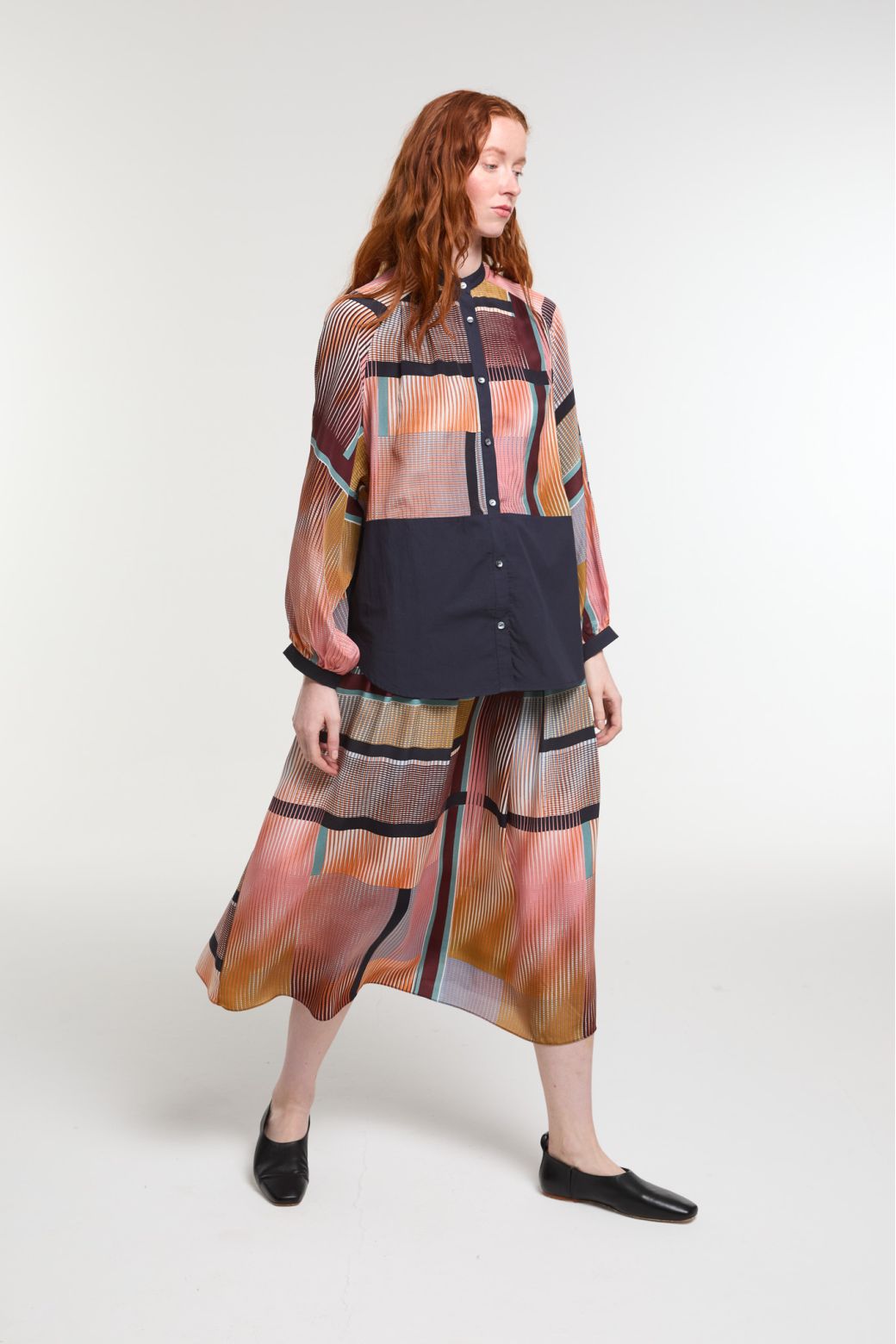 Jupe en soie fluide Romeo imprimé graphique dans les tons bleu nuit / corail de la designer parisienne Ma Poésie Paris.