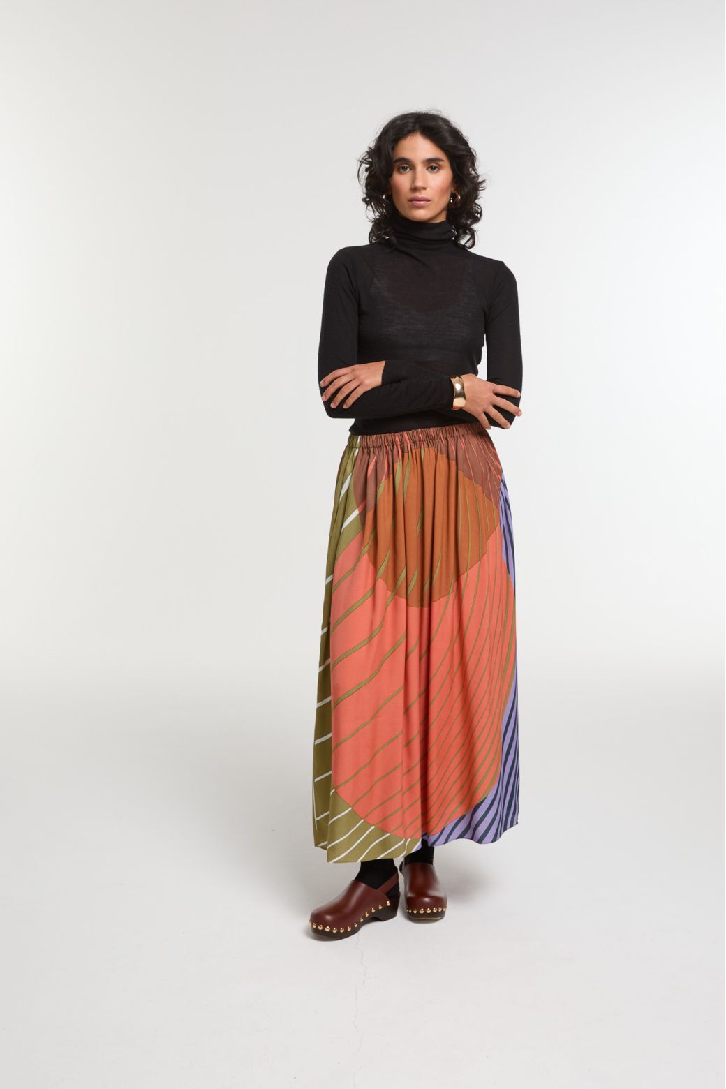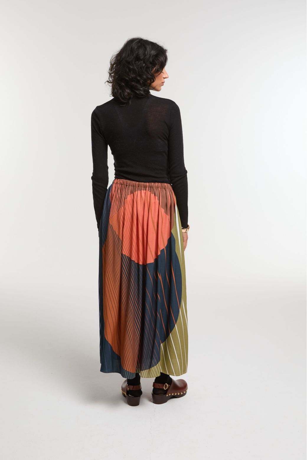 Jupe fluide Romeo imprimé graphique dans les tons orange / kaki / bleu de la designer parisienne Ma Poésie Paris.